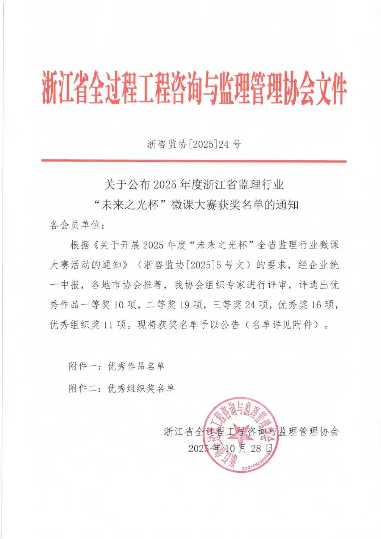 “未来之光杯”微课大赛是浙江省监理行业的重要赛事,旨在推动行业知识共享与技术创新,提升监理人员的专业素养和技能水平。本次获奖不仅是对参赛团队实力的认可,更是对公司专业管理能力的充分肯定。